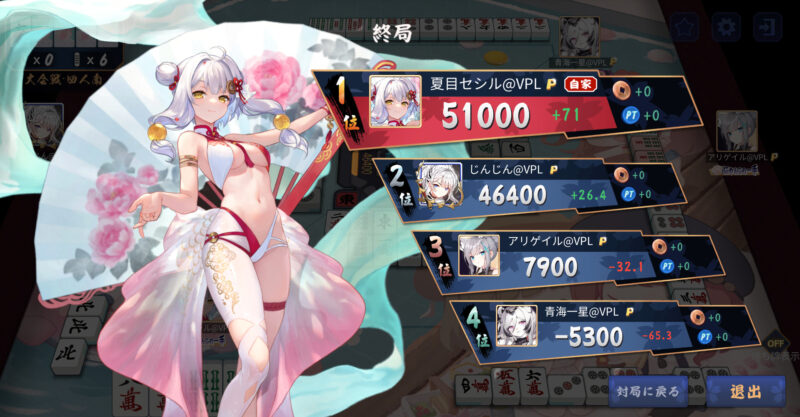 親以外から出アガった場合は2着だが素点もそこそこ回復するので現在トータルスコアがマイナスの私には嬉しく、ダマテンを続行、、、!